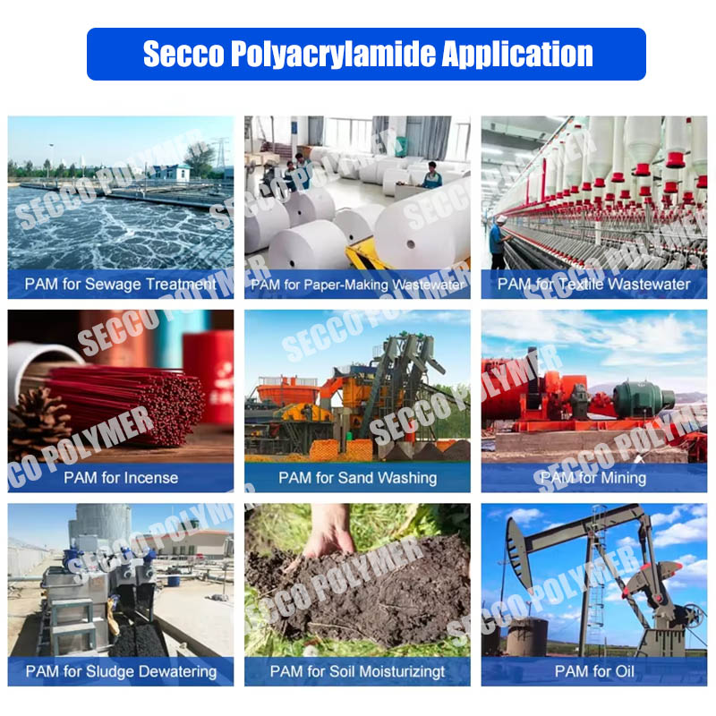 Polyakrylamidemulsion används ofta i en mängd olika hushålls avloppsvatten, kemiskt avloppsvatten, oljefält avloppsvatten, slamvattning, papper och andra områden. Polyakrylamidvatten-i-olje-emulsion används också i stor utsträckning i stads avloppsrening, bryggeri, stärkelsefabrik, livsmedelsanläggningar och annan avloppsrening. Bortskaffande av flokkulering av organiska suspenderade fasta ämnen i sura eller sura avloppsvatten är särskilt lämpligt. I papperindustrin kan det användas som ett retentionshjälpfilter, pappersbehandling av avloppsvatten. Oljeindustrin kan användas som borremulsionsbeläggningsmedel eller avfettningsmedel.